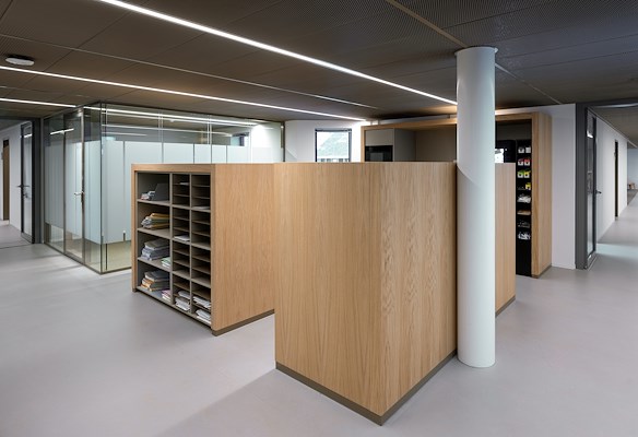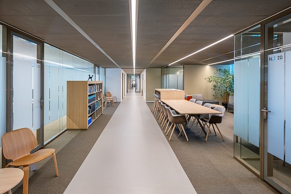 Voor het interieur zijn natuurlijke materialen als hout toegepast, maar ook bronskleurige plafonds van strekmetaal en lichte wanden. “Voor de nieuwe vloeren werken we met een zonering waarbij de vloerafwerking van de gangzones gedeeltelijk doorloopt in de afgesloten ruimtes zodat er een ruimtelijke verbinding ontstaat. De zone aan de gevel is voorzien van projecttapijt in een bijpassende kleur”, aldus dvdp.