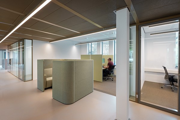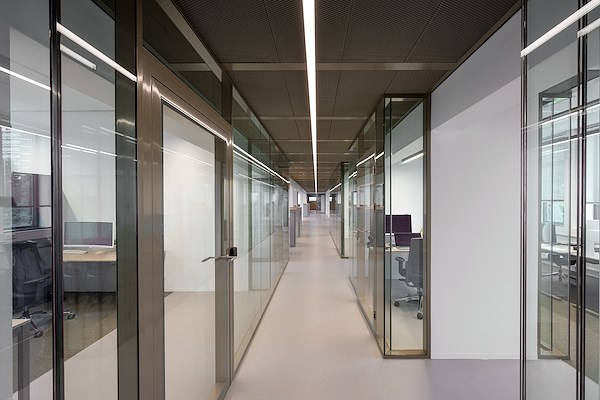 Het vele gebruik van glas, onder meer in glazen systeemwanden die op sommige plekken ‘de hoek om gaan’ versterkt het transparante karakter van het interieur en draagt eraan bij dat daglicht diep het gebouw kan binnendringen.