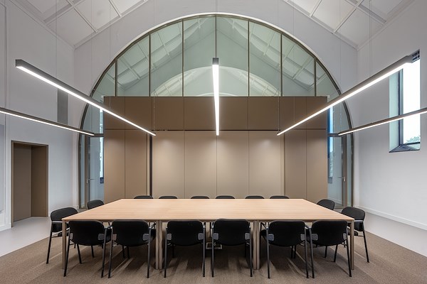 In de hoge ruimte van de voormalige kapel is een opvallende vergaderruimte geplaatst, die met behulp van te openen of sluiten wanden groter of kleiner gemaakt kan worden. Door de tafels telkens anders op te stellen, verandert ook het karakter en de gebruiksmogelijkheden van de ruimte. Op de verdieping onder de vergaderplek bevindt zich het restaurant van de rechtbank.