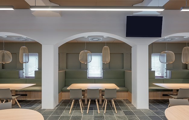 De centrale ontmoetingsruimten zijn zodanig geplaatst dat ze zowel georiënteerd zijn aan de binnenplaats als aan de buitengevel, waardoor er zicht naar buiten ontstaat. De posities aan de binnenplaats, op de kruispunten van de gangen, worden voornamelijk ingezet voor facilitaire zaken zoals postkasten, togakasten en