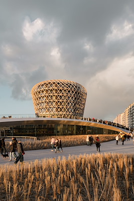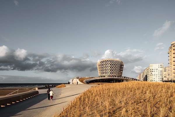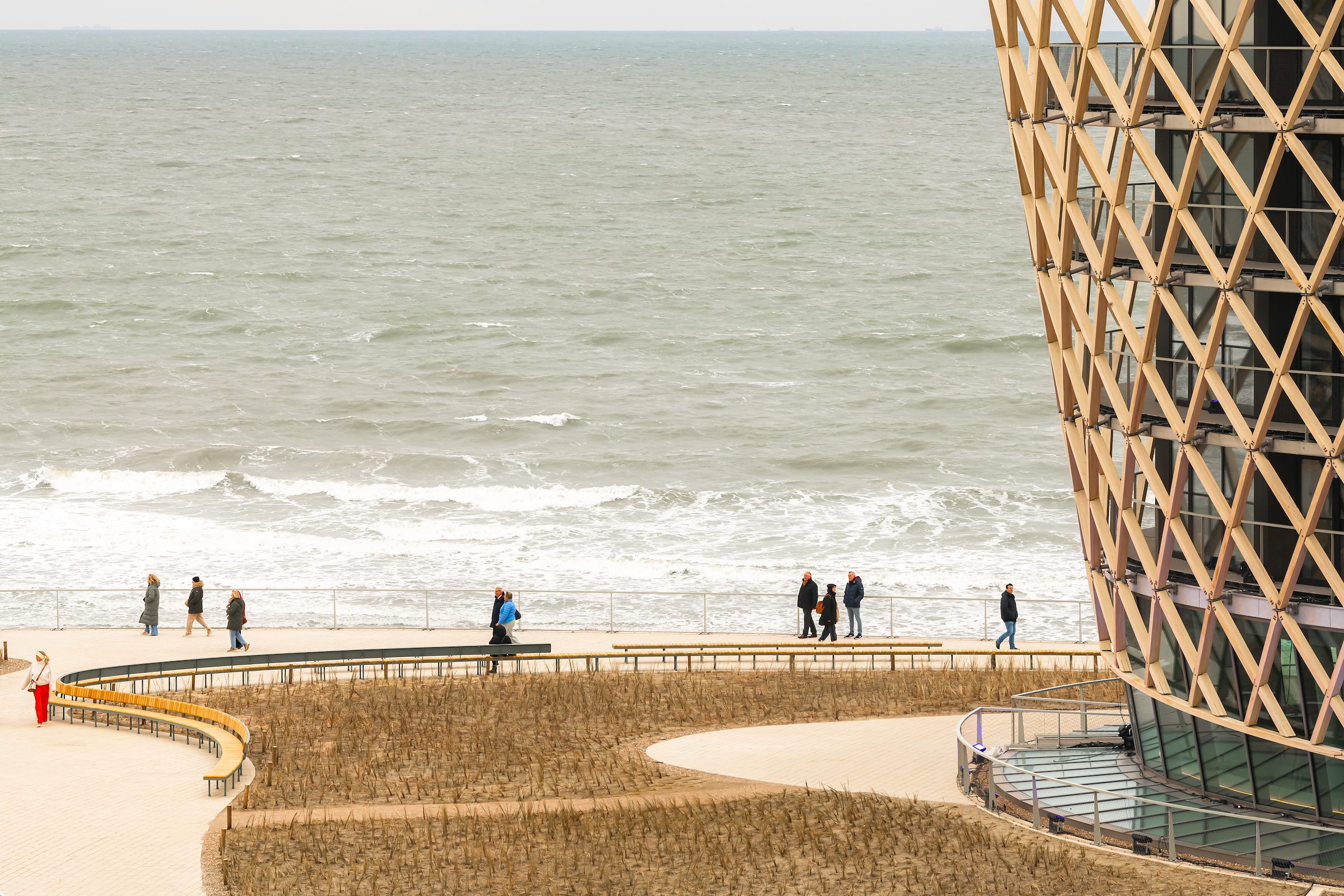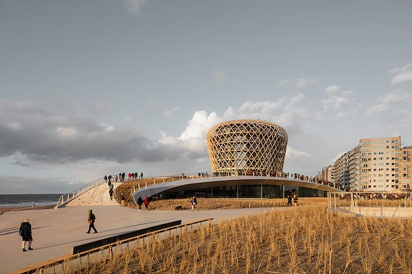 āBij de evenementenruimte is het daglicht wat meer gefilterd. Deze uiterst flexibele ruimte, die een vlakke vloer kan hebben maar ook een tribune, ontvangt van twee zijden daglicht. Vanaf de mezzanine heeft de bezoeker uitzicht op zee. Ook zijn er verschillende doorkijkjes naar het restaurant en de foyer. Indien gewenst is het daglicht in de hele ruimte met gordijnen ook eenvoudig buiten te sluitenā, voegt Ten Wolde eraan toe.