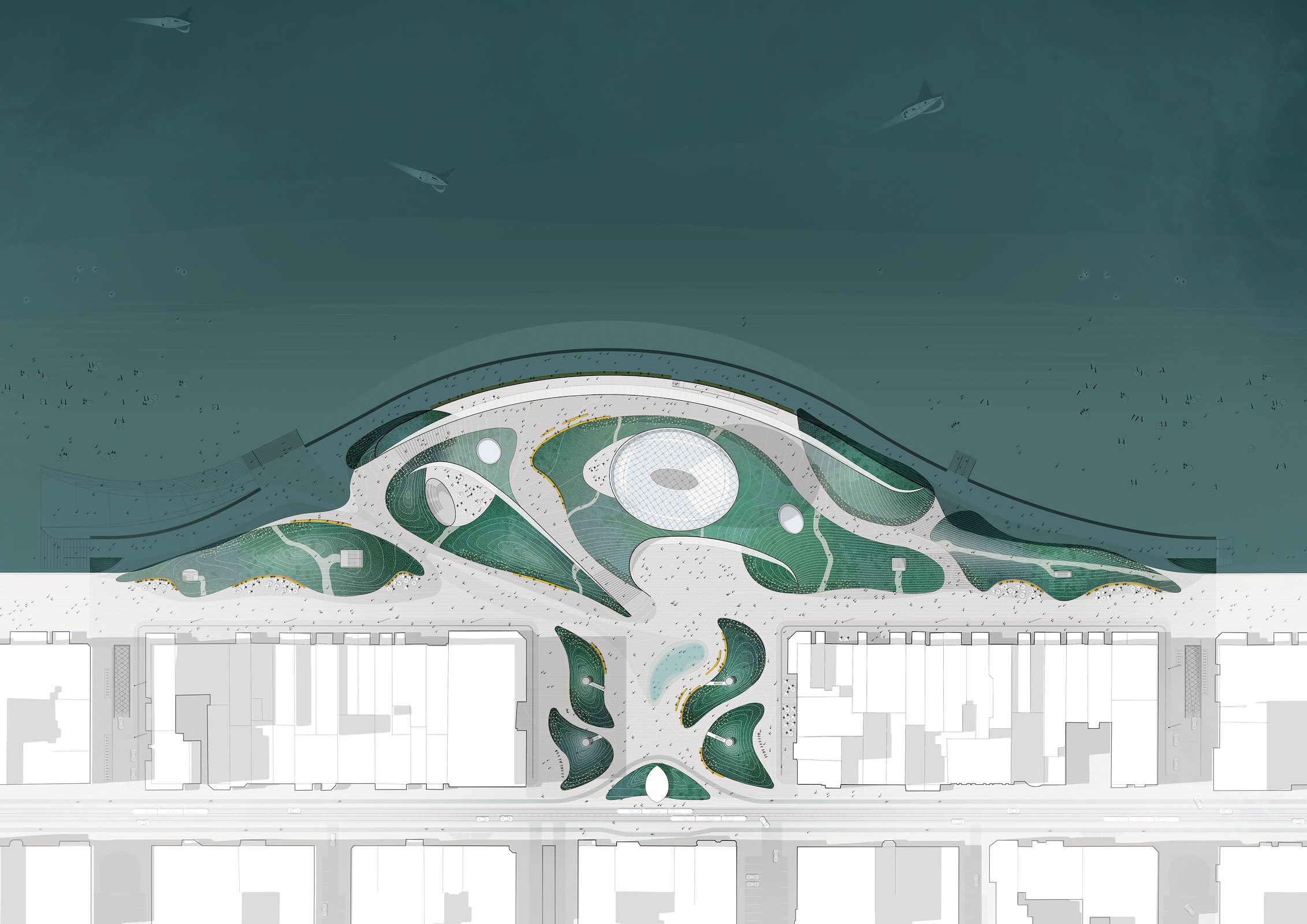 Het casino had het minst behoefte aan daglicht. De grote ruimte hiervoor ligt dan ook bijna geheel onder een duinlandschap. Toch opent ook deze ruimte zich richting het strand en de zee erachter met een lange, glazen pui.