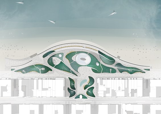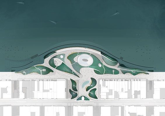 āDe verschillende programmaās die onder het duinlandschap zijn gelegd, hebben een verschillende behoefte aan daglicht. Het restaurant is de lichtste ruimte en ontvangt via twee lange glazen puien daglicht, plus een groot daklicht. Onder dat daklicht ligt een glazen vloer, zodat in de keuken ónder het restaurant ook daglicht valtā, vertelt projectarchitect Leo ten Wolde van ZJA.