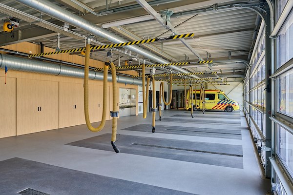 Door middel van grote, goed gepositioneerde gevelopeningen zijn de ambulances en medewerkers zichtbaar voor voorbijgangers. Daarmee wordt de functie van het gebouw getoond. Tegelijkertijd zorgen de grote ramen voor uitzicht op de groene omgeving en ruim binnenvallend daglicht. Dat draagt bij aan een prettige werkomgeving.