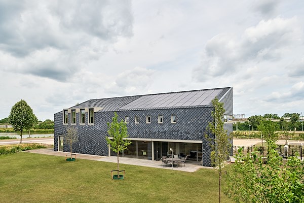 heeft het gebouw een eenduidige uitstraling gegeven met de opvallende gevel- en dakbekleding. Daarvoor lijkt leisteen gekozen, maar het zijn Pretty Plastic-tegels.