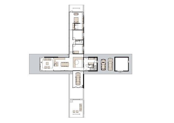 Geïnspireerd door Villa Rotonda van Palladio, maar ook omdat het volledige programma op de begane grond moest worden gehuisvest, heeft de architect de villa een kruisvormige plattegrond gegeven. Het woonprogramma bevindt zich in het hoofdvolume, de slaapkamers zijn ondergebracht in het daardoor heen gestoken tweede langwerpige volume. Het laatstgenoemde bouwdeel ligt veertig centimeter verzonken in de grond en is voorzien van een groendak.