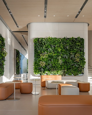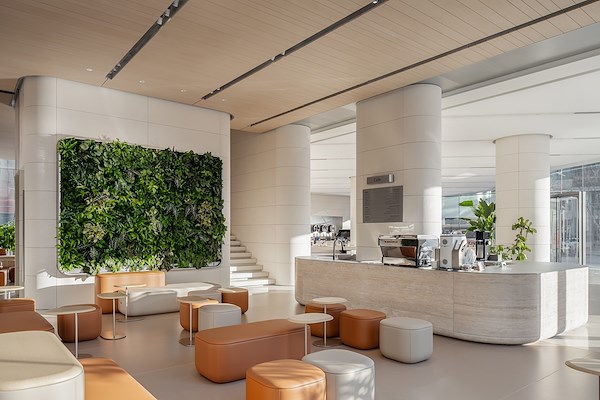 Het Urban Oasis Cafe, voorzien van een koffiebar in travertijn, is een ruimte waar bezoekers elkaar kunnen ontmoeten en producten uitproberen. Ook kan de ruimte worden gebruikt voor evenementen en lezingen. Houten plafondpanelen, groenwanden en andere natuurlijke en warme materialen dragen bij aan een gastvrije sfeer. Vanuit het café voert een trap, met deels glazen treden, naar de tweede verdieping. Vanaf buitenaf is het grote, gebogen led-scherm in het Urban Oasis Cafe al te zien.
