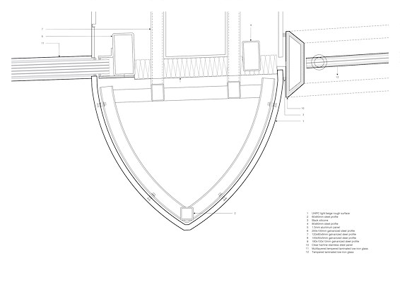 Een transparante gevel over twee verdiepingen moet de voorbijgangers op straat verleiden om de winkel te betreden. De 8,8 meter hoge glazen panelen worden omlijst door gebogen gevelelementen in ultrahogesterktebeton (UHSB). De golvende lijnen van de betonnen gevelelementen verwijzen naar de dansende daklijnen van de oude gebouwen in de stad.