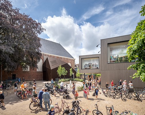 Links de Westerkerk met de nieuwe uitbouw en rechts de uitbreiding van JCK Oldenije