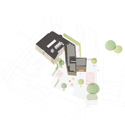 Aan de rand van het dorpscentrum van Zeist, in een door woningen omzoomd binnengebied, ontwerpt Space&Matter een nieuwe buitenschoolse opvang (BSO) en gymzaal.