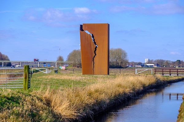 Het Andere Monument van Karel Buskes uit 2019 langs de A7 nabij Westerbroek en Harkstede symboliseert een gebroken baksteen als gevolg van de gaswinning
