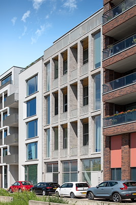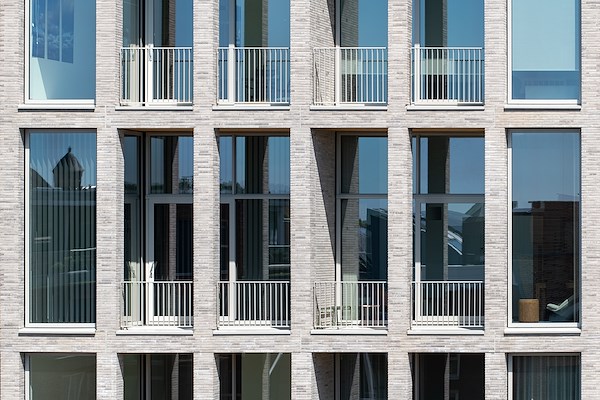 Aan de Nieuwe Gracht in Delft is een appartementengebouw verrezen, dat opvalt met hoge verticale openingen in een bakstenen raster.