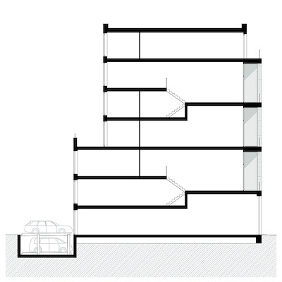 Het uitgangspunt om kwaliteit toe te voegen is ook op de begane grond toegepast. Het kantoor is hoog aan de straatkant en lager waar de meer ondergeschikte functies zijn gesitueerd. Dit kon naar boven een aantal keren worden herhaald, waardoor er drie typen woningen zijn ontstaan.