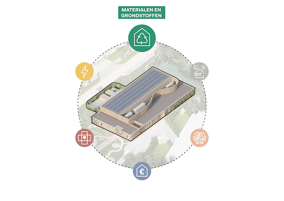 Volgens het ontwerp wordt het gebouw grotendeels gerealiseerd in bio-based en circulaire materialen. De schil van het bewegingscentrum bestaat uit elementen van hout, die zijn gevuld met bio-based isolatiemateriaal. Verder is de dakvloer van de laagbouw vervaardigd met houten kanaalplaatvoeren en zijn de hogere sportzalen geconstrueerd met gelamineerde houten dakliggers.