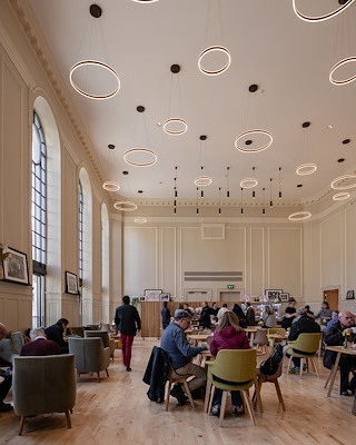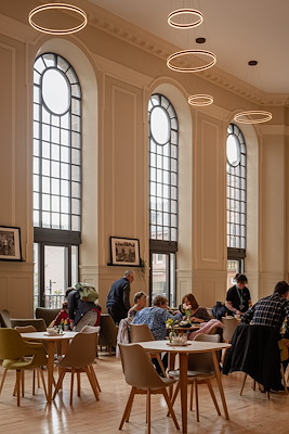 De voormalige kleine zaal is omgetoverd tot een café en evenementenruimte. Door de ramen naar beneden te verlengen, heeft Mecanoo meer uitzicht op de naastgelegen St. Johns Kirk en de straat gecreëerd, komt er meer daglicht de ruimte binnen en kunnen gebruikers dankzij nieuwe deuren direct naar buiten vanuit deze ruimte.