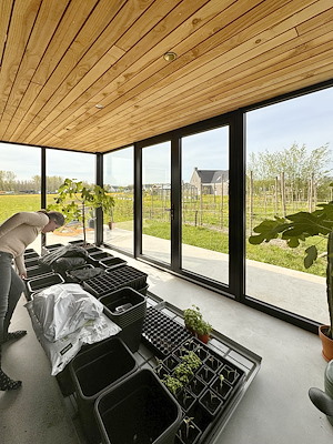 Een planten- en groentekas vangt juist warmte op en buffert die naar het huis. Een eigen ondergrondse regenwateropslag zorgt voor buffercapaciteit en besparing van drinkwater. Zoals gebruikelijk in Oosterwold is minstens de helft van de kavel bestemd voor stadslandbouw. Ook beschikt de woning over een geïntegreerde kas, waar gewassen uit de boomgaard en moestuin verder kunnen groeien.