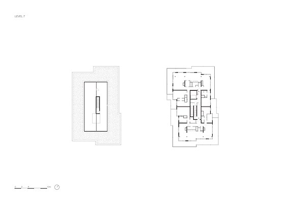 Het oostelijke gebouw heeft een extra verdieping met twee penthouses van ongeveer 160 m², met uitzicht over de buurt. De gebouwinstallaties van beide gebouwen zijn opgenomen in het volume, waardoor het daklandschap vrij blijft van technische componenten, behalve de zonnepanelen.