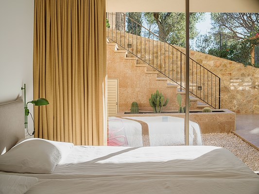 De villa staat stevig als een monoliet in een heuvelachtige Spaanse landschap. De uitvoering in natuurlijke kleuren en materialen zorgen voor een optimale integratie van Casa Tamariu in haar omgeving. Zandkleurige natuursteen, afkomstig uit een groeve zo’n 300 kilometer zuidelijker aan de Spaanse kust, vormt de basis. Door gelijke behandeling van alle vlakken lijkt het alsof de plint van de villa uit de rotsen is gehouwen, aldus Keizer Koopmans.