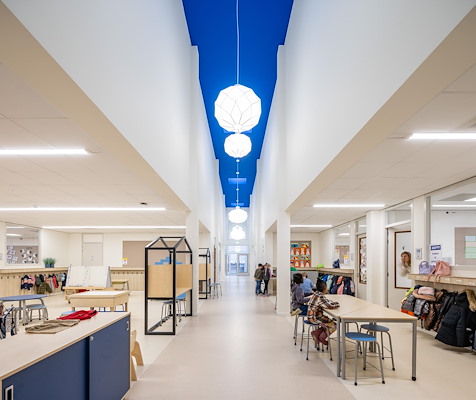 De zones met lokalen aan weerszijden van de centrale as zijn licht en uniform ontworpen en liggen aan multifunctionele leerpleinen. In deze dynamische, speelse ruimten kunnen leerlingen van de verschillende scholen elkaar vanzelfsprekend ontmoeten.