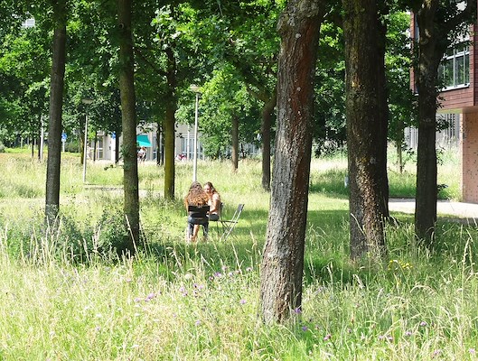 De daken van de plint hebben een groene landschappelijke inrichting om het project klimaatadaptief te maken en de biodiversiteit te versterken. Bovendien verhoogt deze groene inrichting de verblijfs- en woonkwaliteit. De bouwlaag tussen plint en opbouw biedt ruimte aan een collectief programma of bijzondere woonvormen, om zodoende dit groene opgetilde maaiveld maximaal te benutten; het wordt voor alle gebouwgebruikers toegankelijk.