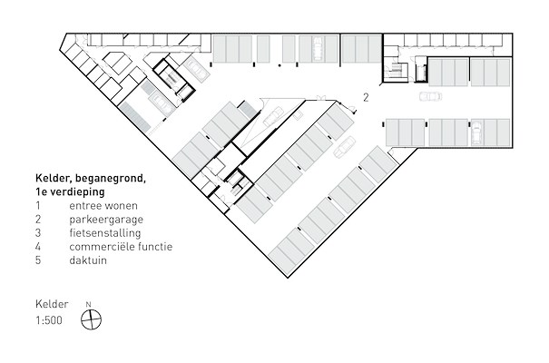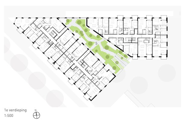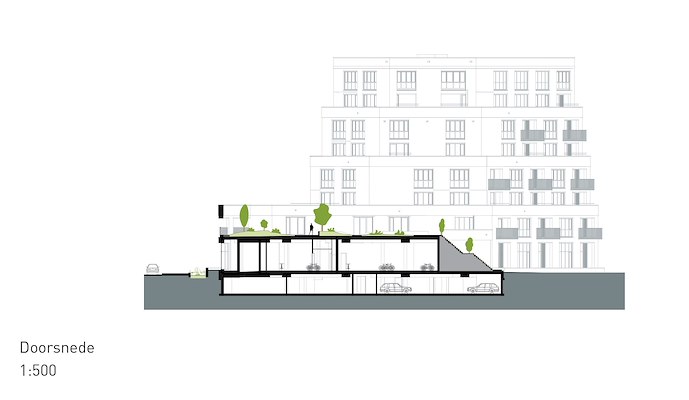 ontwierp dit deel, alsmede het groen op de overige daken. De doorsnede, die dus een tweezijdige oriëntatie van de woningen mogelijk maakt, loopt overigens niet door tot aan de begane grond maar eindigt boven de plint. De verhoogde daktuin ligt zo op de eerste verdieping en biedt de bewoners een riante groene ruimte die met een brede stenen buitentrap aansluit bij het geplande openbaar groen op het andere deel van kavel. De kwaliteit en aanwezigheid van groen was van meet af aan een centraal thema. Door het vroeg inschakelen van een landschapsarchitectenbureau heeft de biodiversiteit een boost gekregen met hoogwaardig groen en watervertragende groenstroken. Om de kwaliteit van de zorgvuldig gekozen vegetatie op peil te houden wordt die collectief beheerd.