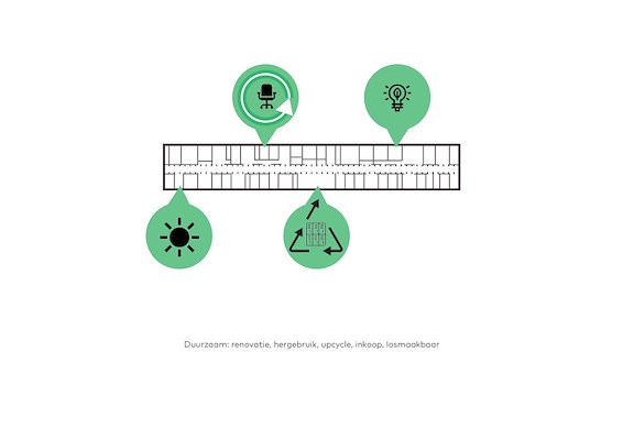 van circulair bouwen centraal (Refuse, Reduce, Renew, Re-use, Repair, Refurbish, Remanufacture, Re-purpose, Recycle, Recover). Zo zijn honderden meters aan voormalige boekenplanken verwerkt tot lockers, en werden glaswanden en meubels met slimme aanpassingen herplaatst, vertelt EGM architecten.