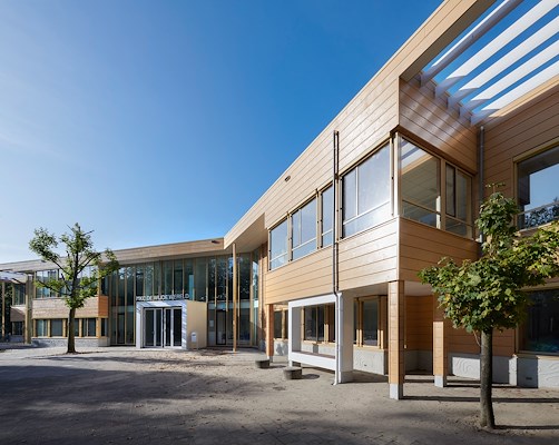 een van de oudste houten schoolgebouwen van Nederland gerenoveerd. Montessori Kindcentrum De Wijde Wereld in stadsdeel Schalkwijk heeft onder meer een nieuwe houten gevel en interieur gekregen. Voor de gevel zijn massief houten balken of ‘logs’ toegepast, waardoor er anders bij conventionele houtskeletbouw alle hoeken van de gevel open konden worden gemaakt.