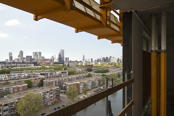 Behalve woningen komt in de toren een ruimte voor publieke functies, zoals een café of restaurant. Op die manier wordt het plein rond het gebouw geactiveerd en krijgt de levendigheid van het gebied een impuls. “Dat wordt een heel spannende ervaring”, zegt Van Oort. “Straks kun je vanaf het terras genieten van het uitzicht op de Maas, terwijl je verderop in de Piekstraat een vrachtwagen ziet laden en lossen.”