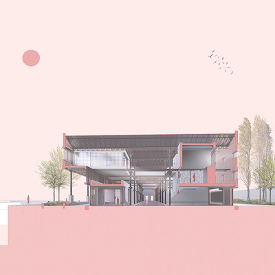 “Dit project bepleit een inclusieve en gemeenschapsgerichte architectuurpraktijk, geïnspireerd door het concept van de 'commons'. In Burgess Park, Zuid-Londen, worden vier rode paviljoens geïntroduceerd als speelvelden voor sociale interactie, met gebruik van lokale materialen en ambachtslieden. De presentatie valt op door een lange overzichtstekening en beelden van het gemeenschapsproces, waarbij sociaal engagement en een oproep tot systeemverandering centraal staan.”
