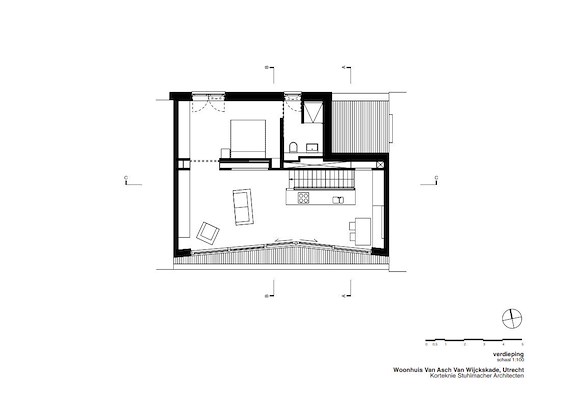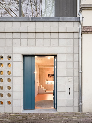 De opzet van de nieuwe woning is ontleend aan de oorspronkelijke typologie van de woningen met daartussen een gesloten tuinmuur in een strenge, abstracte en volledig symmetrische uitwerking, meldt Korteknie Stuhlmacher. Omwille van de bewoonbaarheid is de nieuwe ‘muur’ annex voorgevel geperforeerd en zijn erachter ramen geplaatst voor daglichttoetreding. De kleine perforaties zorgen tevens voor privacy en bieden een levendig spel van licht en schaduw aan de binnenzijde.