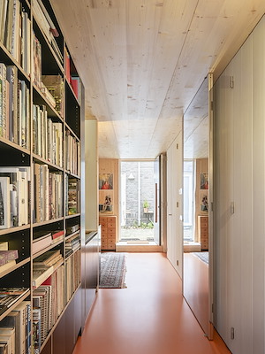 Waar de muur is uitgevoerd in ‘brute’ betonstenen, bevindt zich erachter een interieur, gerealiseerd van het natuurlijke materiaal hout (CLT) en op maat gemaakt meubelwerk. Op de begane grond bevinden zich de entree, een werkruimte voor elk van de twee bewoners en voorzieningen als het sanitair. Op de verdieping liggen de woon- en slaapkamer.