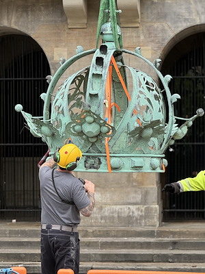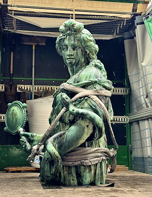 “Regen, vuil en wind tasten het beeldhouwwerk in wit marmer en de bronzen attributen aan”, meldt het paleis. Tegelijkertijd biedt het onderhoud volgens het paleis ‘een unieke eenmalige kans om deze bijzondere objecten van dichtbij te bekijken, voordat ze gerestaureerd voor jaren weer het dak op gaan’.