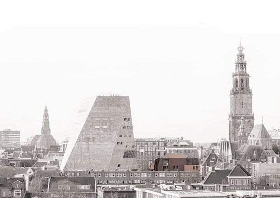 Het naastgelegen Groninger Forum is door NL Architects ontworpen als een icoon dat zich nadrukkelijk onderscheidt van het middeleeuws stedelijk weefsel. Bij Vrijdag heeft de combinatie van NEXT en Koschuch architects juist gekozen voor integratie en een ingetogen verschijning.