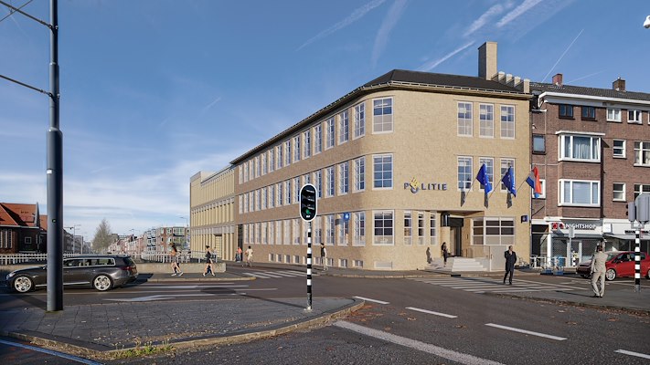 De nieuwbouw vormt als het ware een verlenging van het bestaande gebouw, waarbij oud en nieuw secuur op elkaar aansluiten; dat gebeurt zowel in de gevel en de rooilijn, als in de zorgvuldig gekozen materialisatie, zegt EGM. Het nieuwe deel is als het ware in kleur en ritmiek een eigentijdse exponent van het pand uit de jaren dertig. Net als het bestaande deel krijgt de nieuwbouw drie verdiepingen. Het bureau krijgt een veilige en discrete parkeergelegenheid voor politievoertuigen en -fietsen.