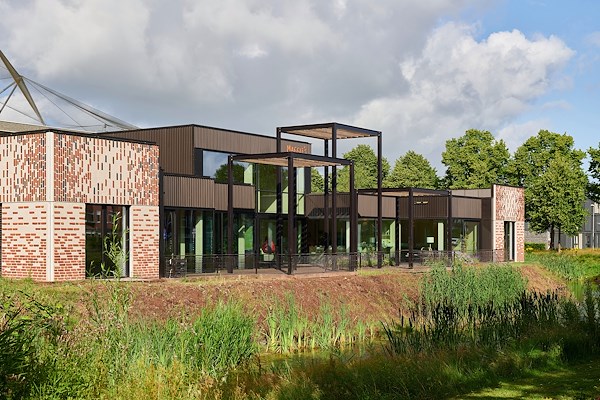 De gevel aan de andere kant bestaat met zijn verdiepingshoge pui van donkerbruin geanodiseerd aluminium grotendeels uit glas en opent zich naar het landschap met de groene wetering. De beleving van alle seizoenen is het uitgangspunt. Een stelsel van bamboe-terrassen met verspringende vlonders biedt uitzicht op het water dat omzoomd is door een rietkraag. Pergola’s bieden beschutting tegen zon en fel daglicht, die veel patiënten niet kunnen verdragen.