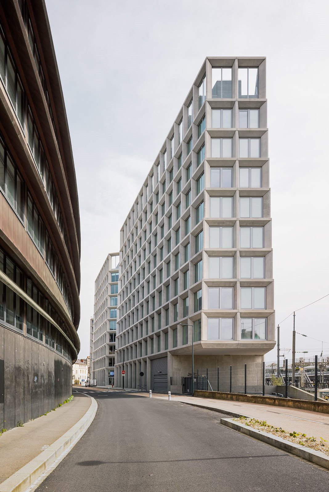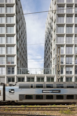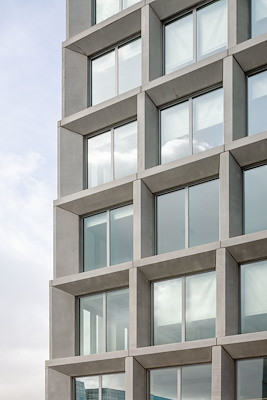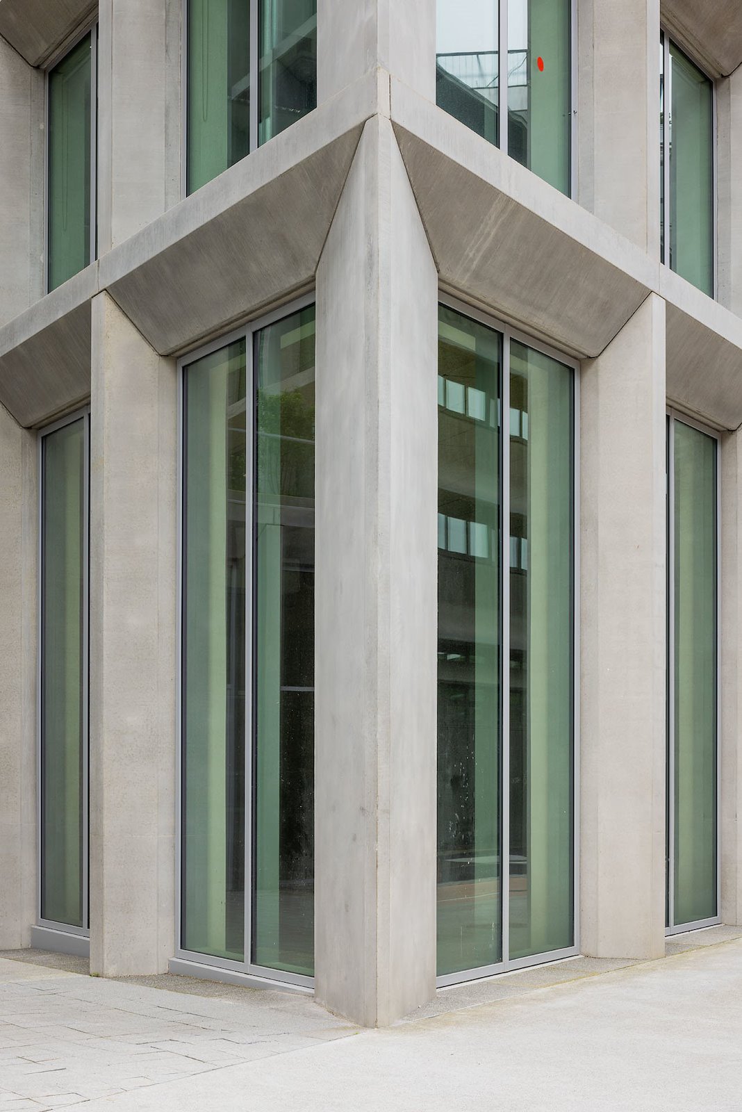 De architectenbureaus besloten de vereiste afschuiningen en hellingen van de volumes zo te gebruiken dat ze niet alleen een formeel gebaar maken, maar ook leef- en verblijfskwaliteit binnen het project verhogen, vertelt Atelier Kempe Thill. Door de wijze waarop de plattegronden zijn afgeschuind, openen de relatief smalle ruimten tussen de gebouwen naar buiten, wat meer daglicht tussen en in gebouwen brengt en de zichtlijnen verbetert, vooral bij de appartementen. Ook de helling van de gevels is op die manier gebruikt. Daarbij zijn de gevels bovendien voorzien van ongeveer 15 cm diepe neggen.