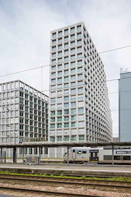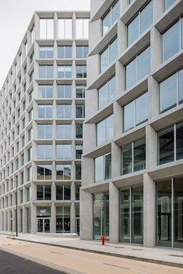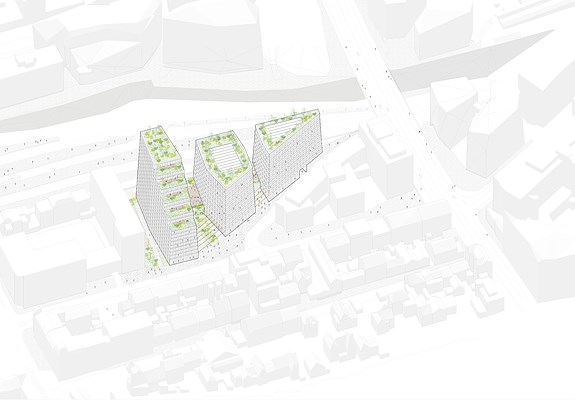 De architecten stonden voor de vraag hoe ze zich moesten verhouden in dit project, vooral met het oog op de stedenbouwkundige eisen. “Beide bureaus staan voor op logica en rationaliteit gebaseerde architectuur, die een puur formeel korset dat van buitenaf wordt opgelegd als problematisch ervaart”, legt Atelier Kempe Thill uit. Bij tussentijdse presentaties werd al snel duidelijk dat alternatieve ontwerpen – bijvoorbeeld horizontaal gelaagder, met een meerlaagse basis, om meer afstand tussen de bovenliggende volumes te creëren – niet werden geaccepteerd.
