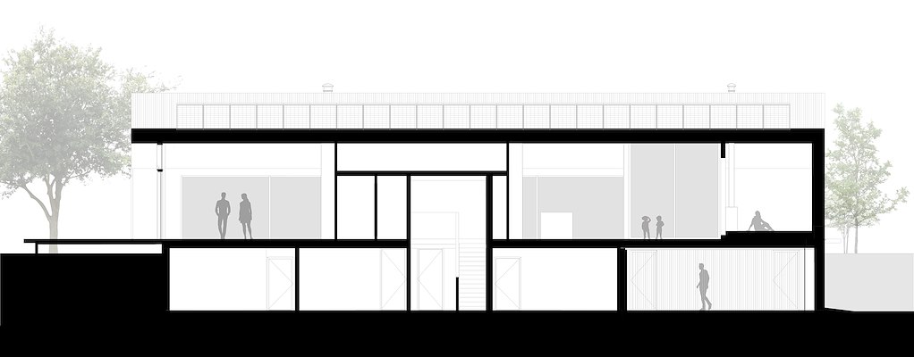 De begane grond is ontworpen als een grote open vrije ruimte. Deze ruimte is georganiseerd door één volume met voorzieningen, een inpandige buitenruimte en twee haarden. Samen met een hoogteverschil in de vloer ervoor zorgen deze elementen voor verschillende plekken in de woning, met elk een eigen karakter.
