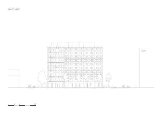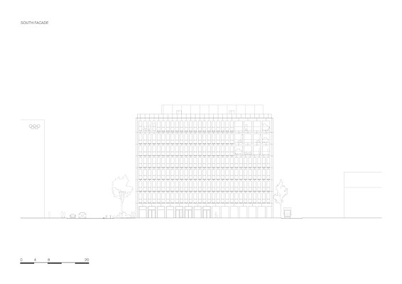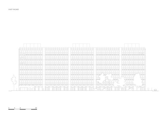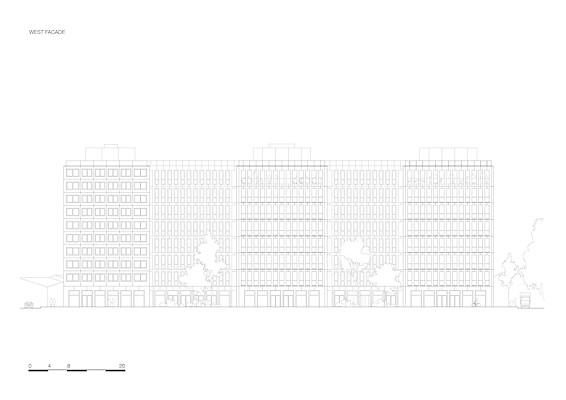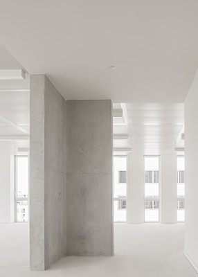 Aan de oostzijde maken dunne voorgespannen holle platen het mogelijk om de benodigde dertien meter te overspannen, legt KAAN Architecten uit. Aan de westzijde bevatten drie naar voren uitstekende volumes, elk negentien meter breed, centrale circulatiekernen en werkruimtes of hotelkamers aan de gevel.