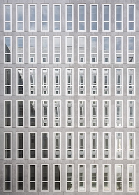Voor het kantoorgedeelte biedt het gevelraster flexibiliteit voor de vloerindeling, met om de 1,35 meter een massief geveldeel van 43 centimeter. Prefab betonnen T-elementen vormen structuur en gevel van het gebouw, zonder cosmetische toevoegingen. De 43 cm-secties zijn horizontaal uitgelijnd, waardoor het gevelsysteem zichtbaar wordt en een uniform raster over het gehele kamvormige volume ontstaat.