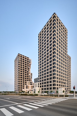 Hierdoor ontstaan terrassen en erkers, die zorgen voor fysieke en visuele verbinding met het plein. Op de begane grond liggen restaurants, cafés en winkels, terwijl de verdieping erboven plaats biedt aan een sportschool, medische kliniek, voorschools onderwijs en kantoren. De andere verdiepingen in de torens zijn bestemd voor in totaal 525 woningen.