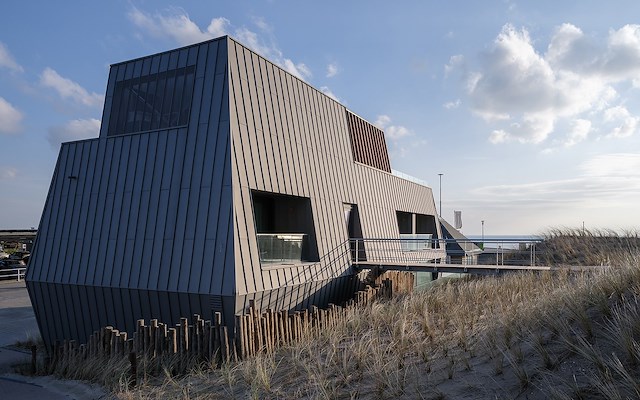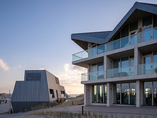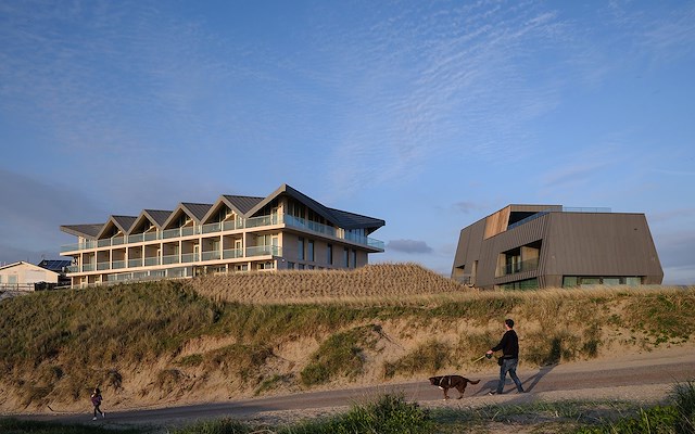 De beperkte bouwenveloppe en een ingetogen materiaalkeuze waren uitgangspunten voor de nieuwe gebouwvolumes met het oog op een ingetogen inpassing in het duinlandschap. Tegelijkertijd geven de vorm van het dak en de ritmiek van de gevelkaders het hotel een uitgesproken voorkomen. De kartelvorm van het dak refereert aan de oude strandarchitectuur, meldt diederendirrix.