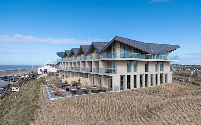 Het hotel heeft een natuursteen gevel en houten kozijnen in aansluiting op de kleurschakering van het strand en het duinlandschap. Het zinken daklandschap weerspiegelt de verschillende luchten aan zee op subtiele wijze. De warmtepompen en PV-panelen zijn onzichtbaar opgenomen in het volume van het gebouw.