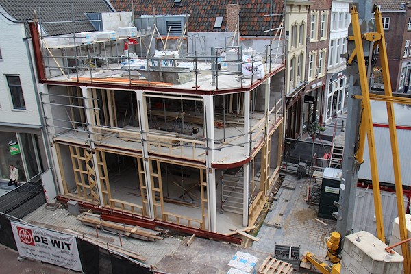 Gekozen is voor een staalconstructie met wanden in houtskeletbouwwanden. De bakstenen zijn in plakken gezaagd en als strips op dampopen isolatiemateriaal aangebracht. Dit betekende een besparing in zowel gewicht als materiaal. In september 2023 opende een nieuwe huurder zijn winkel op de geheelde hoek.