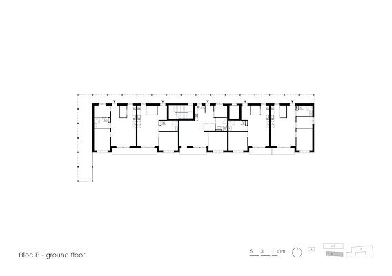 In het centrum van het project ligt het lokaal dienstencentrum. Door het bewust dieper in het bouwblok te situeren hebben de architecten met dit gemeenschapscentrum een verbinding tussen de verschillende gebouwen willen maken. Het vormt bovendien niet alleen een ruimtelijk, maar ook een sociaal centrum.