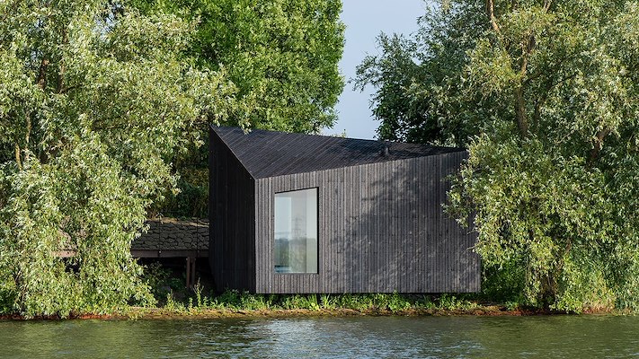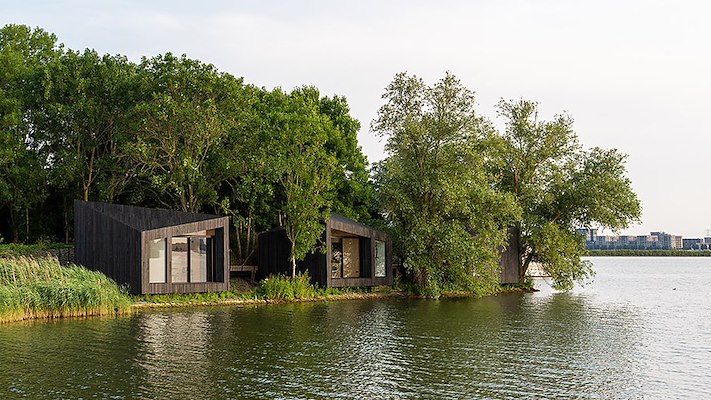 De gebouwtjes zijn voorzien van een houten gevelbekleding, die is behandeld volgens de shou-sugi-ban-techniek. Naast het feit dat de verkoolde toplaag het hout verduurzaamt, gaan de huisjes hiermee in de loop der tijd nog meer op in de natuurlijke omgeving, zeggen Van Delft en Steinhauser.