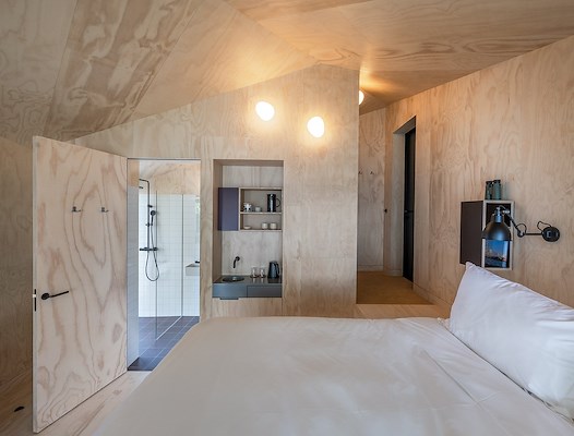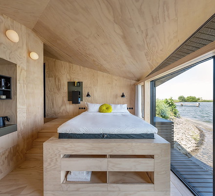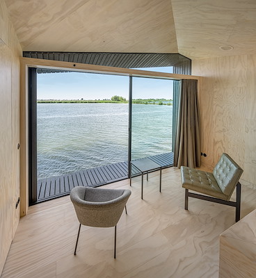 Terwijl de huisjes buiten opgaan in hun natuurlijke omgeving, omarmt het interieur de bezoeker en laat hem of haar optimaal genieten van de plek. Elk slaaphuisje heeft een op de omgeving afgestemd, gericht uitzicht op de natuur en het water.