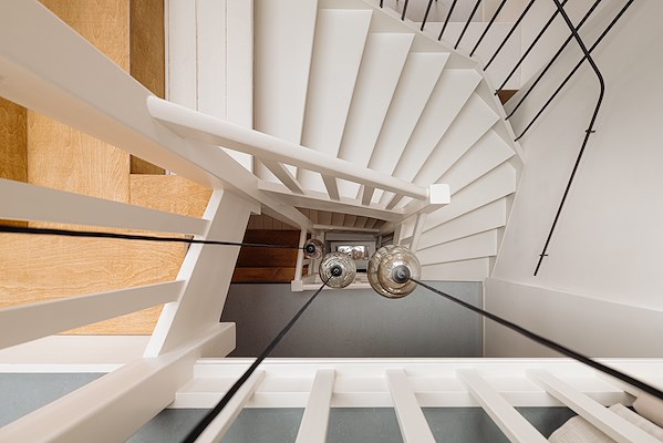 Nieuwe stalen trapstijlen fungeren als dragers voor de bestaande trap, die voorheen afdroeg op een wand. De lichtrails zijn weggewerkt tussen de vloerdelen. De bestaande staalkolom heeft een blauwe accentkleur gekregen in het verder ingetogen ontwerp. “Deze ingrepen, waarbij alle elementen zijn geïntegreerd, ondersteunen de rustige uitstraling van het interieur”, aldus Studio SAAM.