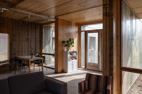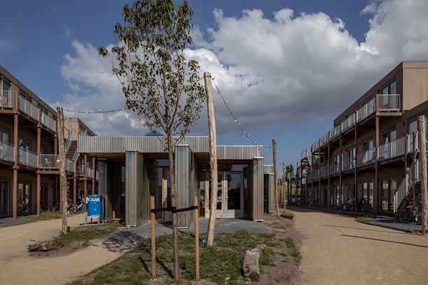 voor gezinnen) nog meer ruimte te bieden, is centraal in de binnentuin een collectieve huiskamer gerealiseerd. Dit gebouw bestaat voor tachtig procent uit hergebruikte materialen, waarvan vele zijn bewerkt om ze weer bruikbaar en degelijk te maken.