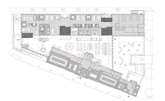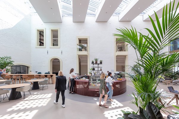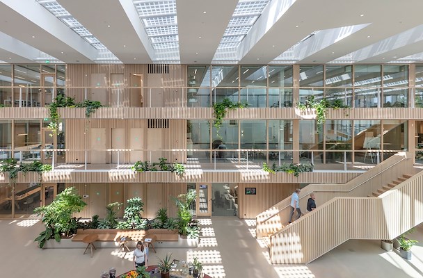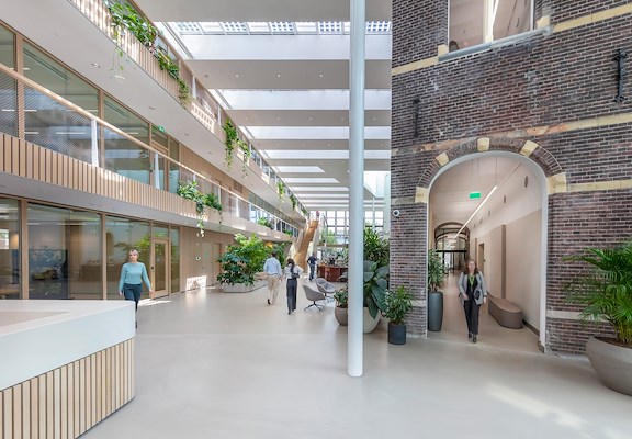 Het atrium heeft een grand café-achtige sfeer. De gevels van beide bouwdelen zijn op harmonieuze wijze afgewerkt en de toepassing van onder meer natuurlijke materialen als hout en ronde vormen versterken de visuele eenheid. Het meubilair is zoveel mogelijk hergebruikt of geproduceerd van ‘geoogste’ materialen. Daarnaast zijn emissievrije materialen toegepast en is de verwerking van het maatwerk modulair en demontabel, aldus de architecten.